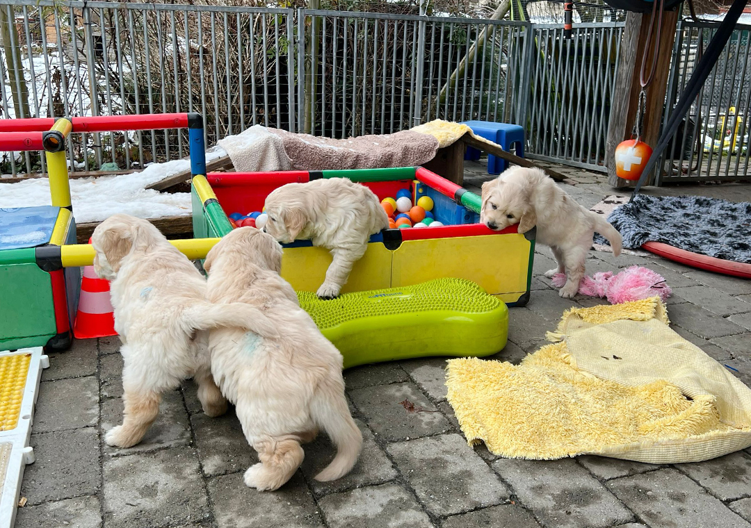 Alle 6 Welpen sind top fit, neugierig und aufgestellte Golden Retrievers. Sie geniessen den Besuch, spielen gerne im ganz grossen Aussenbereich, erkunden die Spielgeräte und messen sich in kleinen Kämpfchen untereinander.