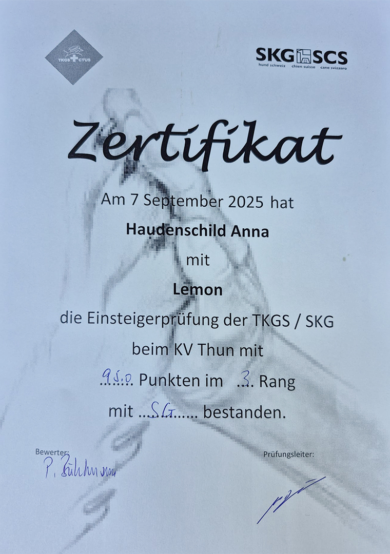 Wie grossartig! Der coole „Lemon“, On my way with Lemon of Golden Motions, hat mit seiner Hundeführerin Anna Haudenschild das Zertifikat für die Einsteigerprüfung der TKGS / SKG mit 95 Punkten und der Bewertungsnote: „sehr gut“ bestanden! Herzliche Gratulation liebe Anna und Lemon zu dieser tollen Leistung!