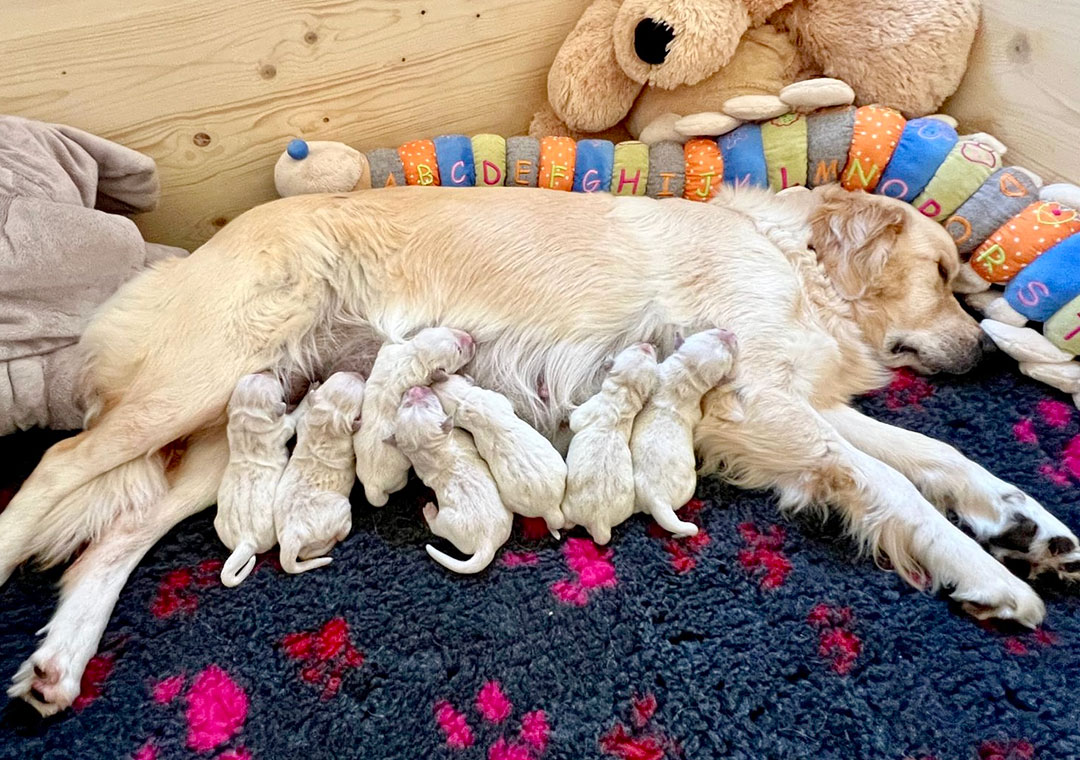 Wir sind sehr dankbar und glücklich, dass uns Pearl und Barclay 7 gesunde Welpen geschenkt haben. Am 24. Oktober 2025 sind 2 Hündinnen und 5 Rüden per Kaiserschnitt zur Welt gekommen. Wir danken Dr. med. vet. Daniel Zimmerli und seinem Team herzlich für die super und einfühlsame Arbeit und Betreuung!